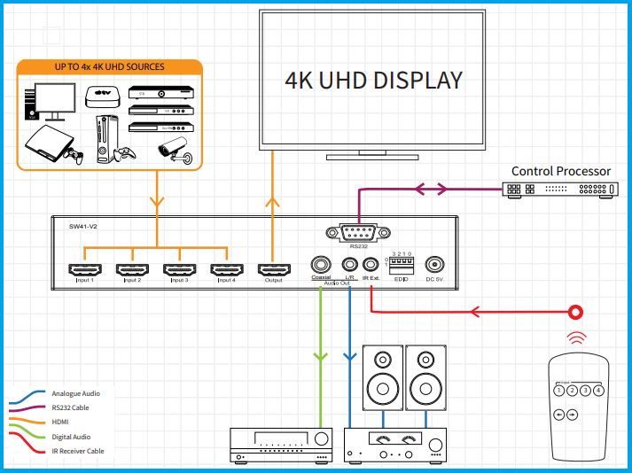 SW41AB-V2 của chúng tôi là một bộ Switch 4-Way HDMI tích hợp tính năng ngắt âm thanh. Bộ Switch hỗ trợ