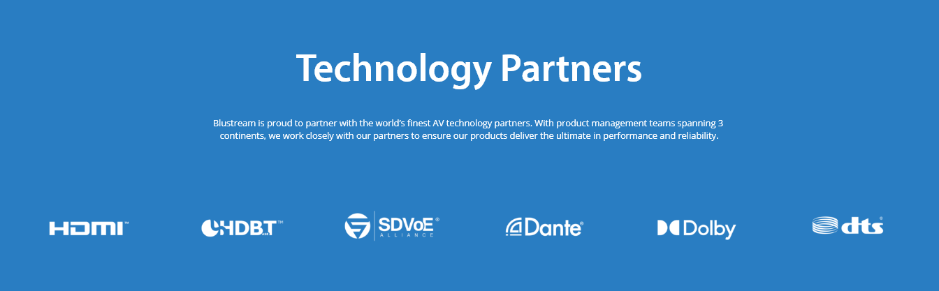 Blustream tự hào được hợp tác với các đối tác công nghệ AV tốt nhất trên thế giới. Với đội ngũ quản lý sản phẩm trải dài khắp 3 châu lục, chúng tôi hợp tác chặt chẽ với các đối tác của mình để đảm bảo cung cấp sản phẩm của chúng tôi đạt hiệu suất và độ tin cậy cao nhất.