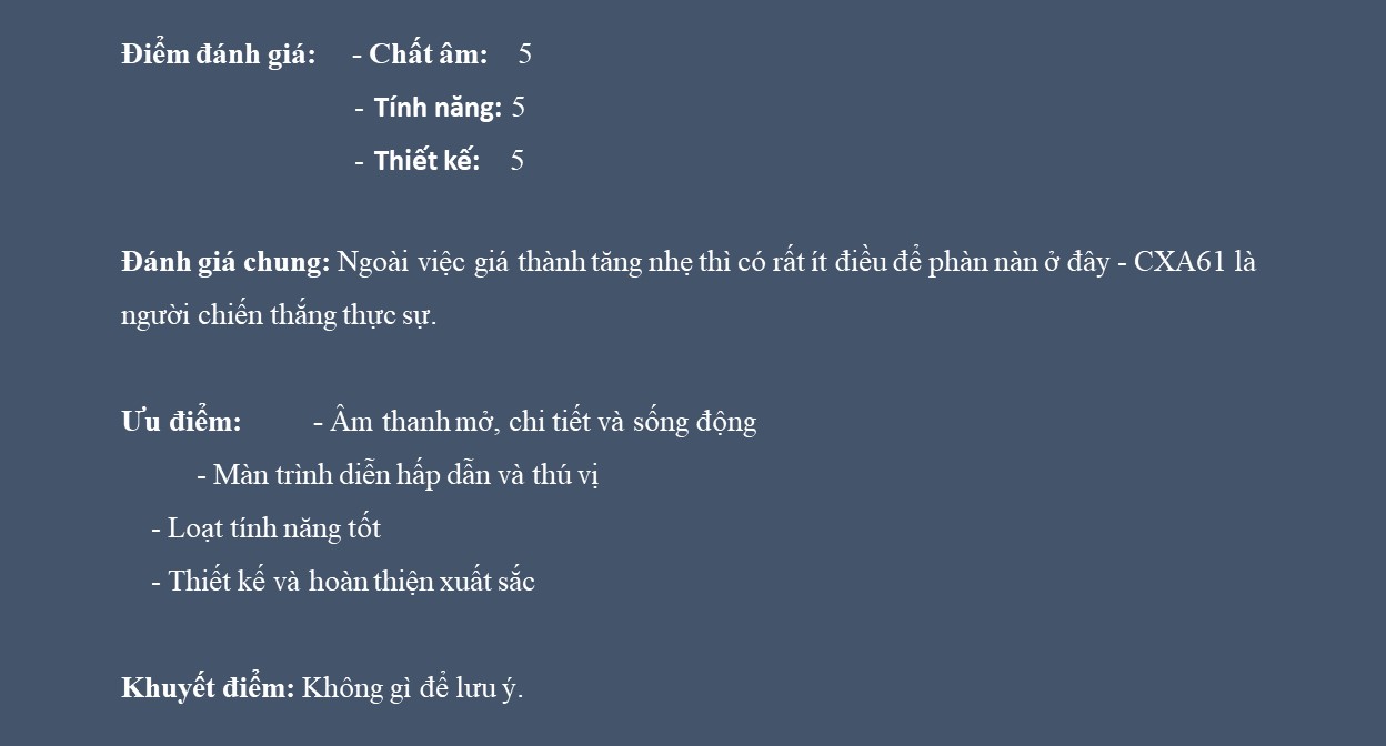 CXA61 có một sự cân bằng âm sắc được đánh giá độc đáo khi dung hòa tinh tế giữa sự mạnh mẽ và sự trau chuốt của âm thanh. Đây là kiểu trình diễn có khả năng phát huy tốt trên nhiều loại loa và thể loại âm nhạc khác nhau. Hình ảnh âm thanh nổi rất ấn tượng, xác định vị trí âm thanh và nhạc cụ chính xác và ổn định. Âm trường rộng lớn và được phân lớp độc đáo, miễn là phần còn lại của hệ thống của bạn phải phù hợp. Khi chúng tôi dành một khoảng thời gian thích hợp để lắng nghe, rõ ràng là rất ít đối thủ có đủ khả năng để đánh bại màn trình diễn của CXA61. Nó đào sâu các chi tiết nhỏ nhất một cách dễ dàng và mô tả chúng một cách cẩn trọng và tinh tế.