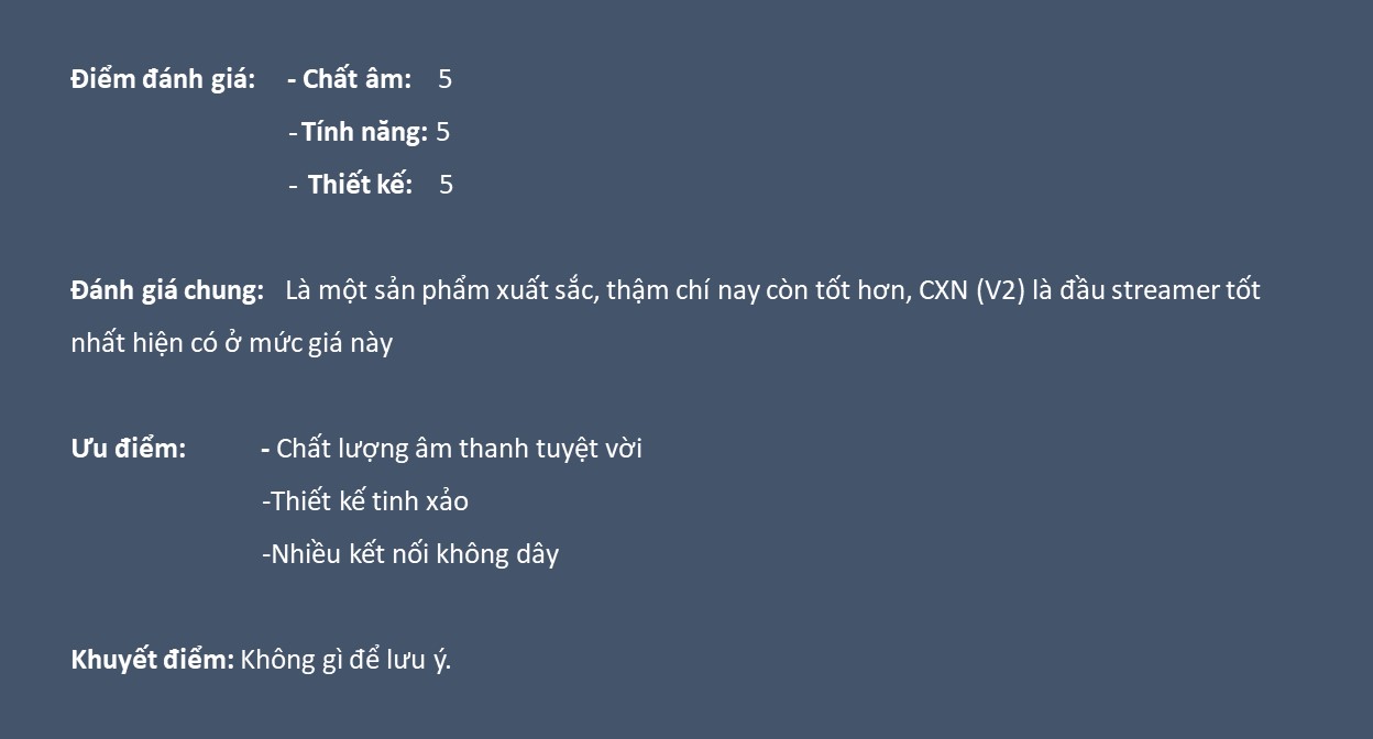 Cambridge Audio CXN (V2) đã giữ lại tất cả các đặc tính âm thanh tuyệt vời của phiên bản gốc. Chất âm sôi nổi, chân thật vẫn vẹn nguyên không đổi thay nhiều so với lần trải nghiệm với phiên bản đầu tiên cách đây ba năm.