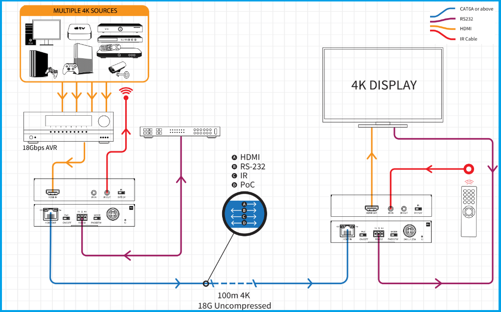 *Khoảng cách truyền tùy thuộc vào định dạng video, loại cáp và môi trường cài đặt. Khuyến nghị sử dụng tối thiểu cáp F / UTP CAT6A.