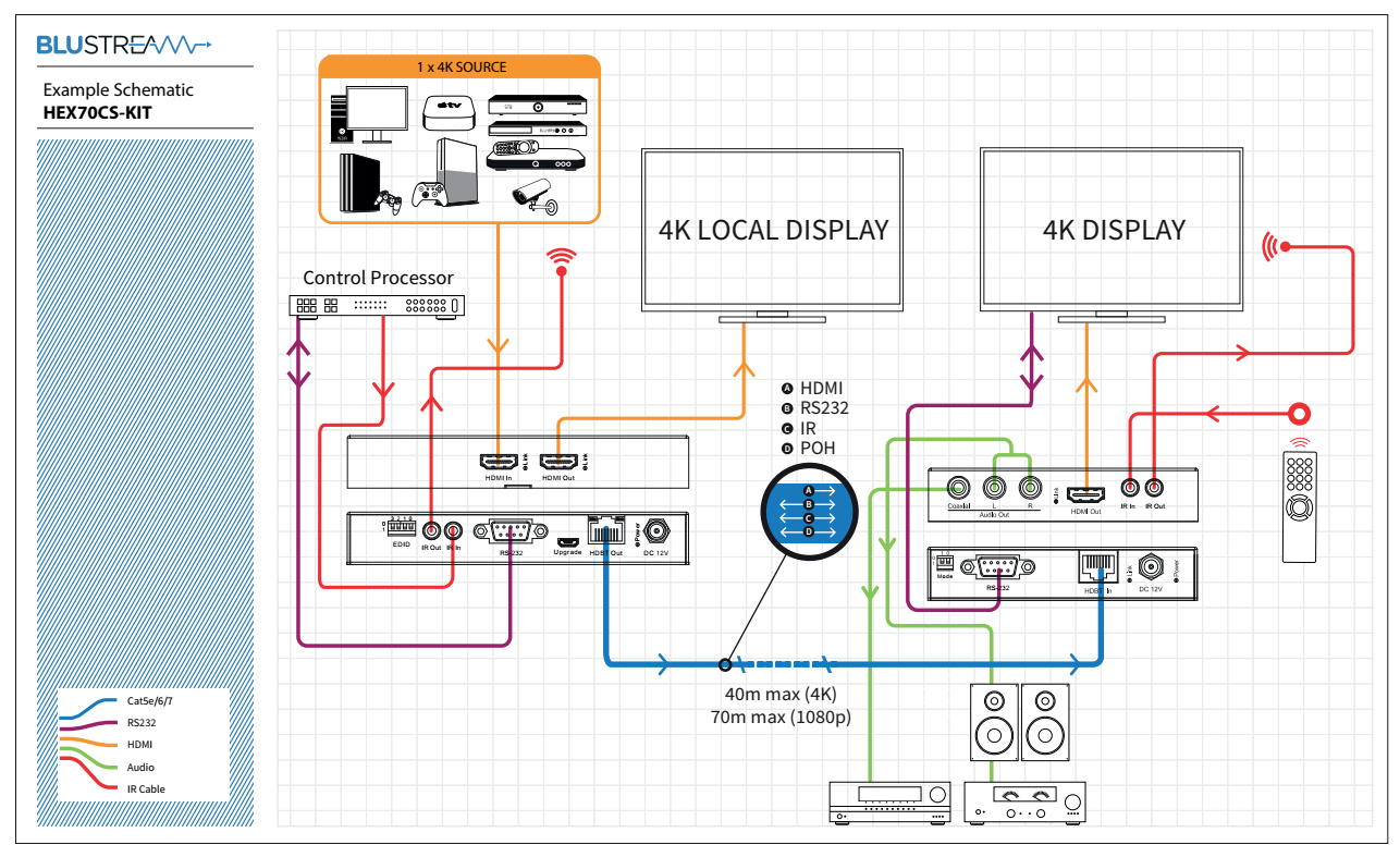 Sản phẩm mở rộng HDMI, IR hai hướng & RS-232 và PoC hai hướng lên đến độ dài 70m (4K đến 40m). Bộ phát bao gồm một ngõ ra HDMI để tích hợp màn hình cục bộ hoặc xếp tầng cho nhiều thiết bị. Bộ thu có tính năng analogue stereo và digital coax audio breakout.