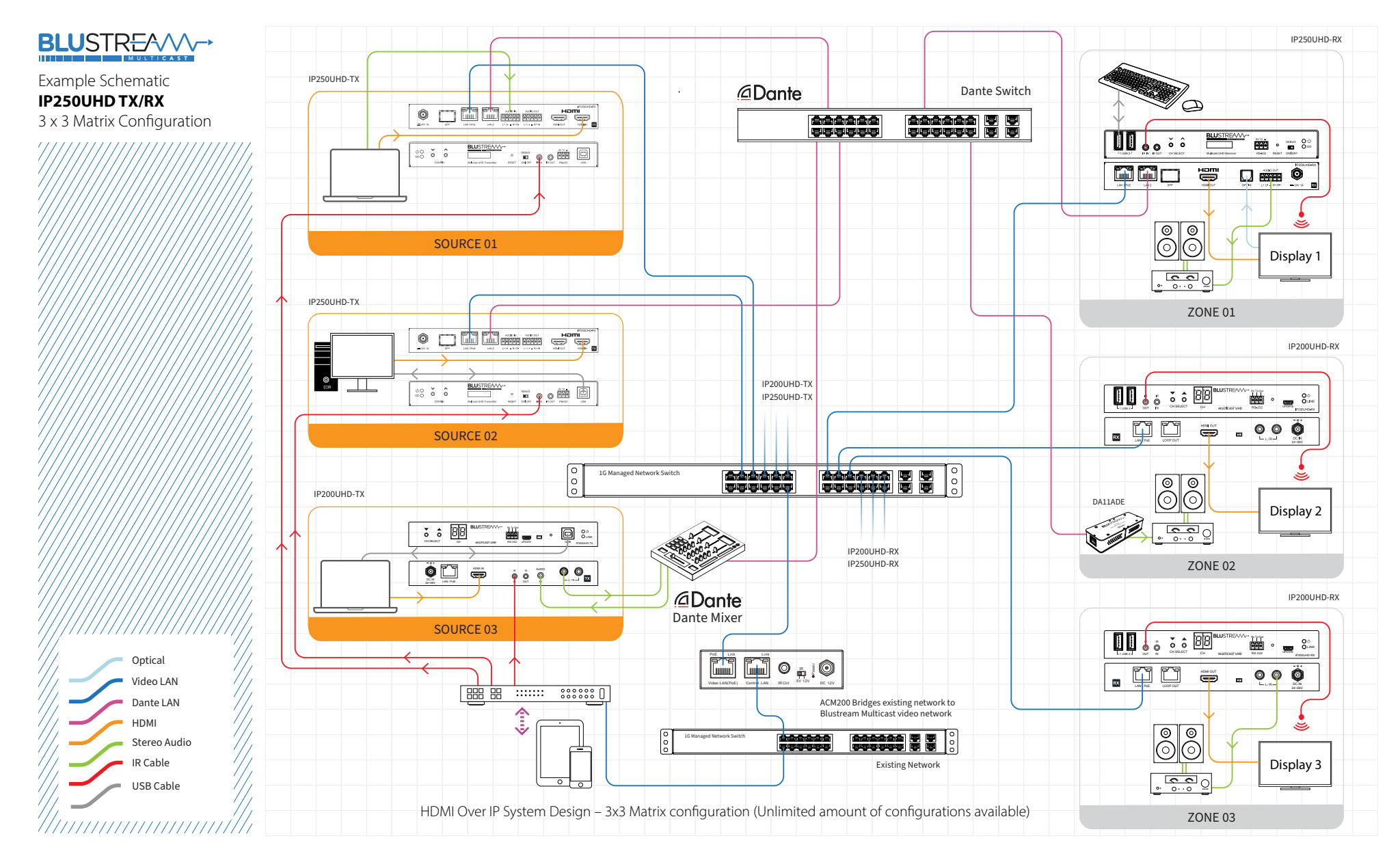 - Cổng mạng RJ45 kép có thể định cấu hình để phân phối tín hiệu HDMI và Dante độc lập hoặc kết hợp