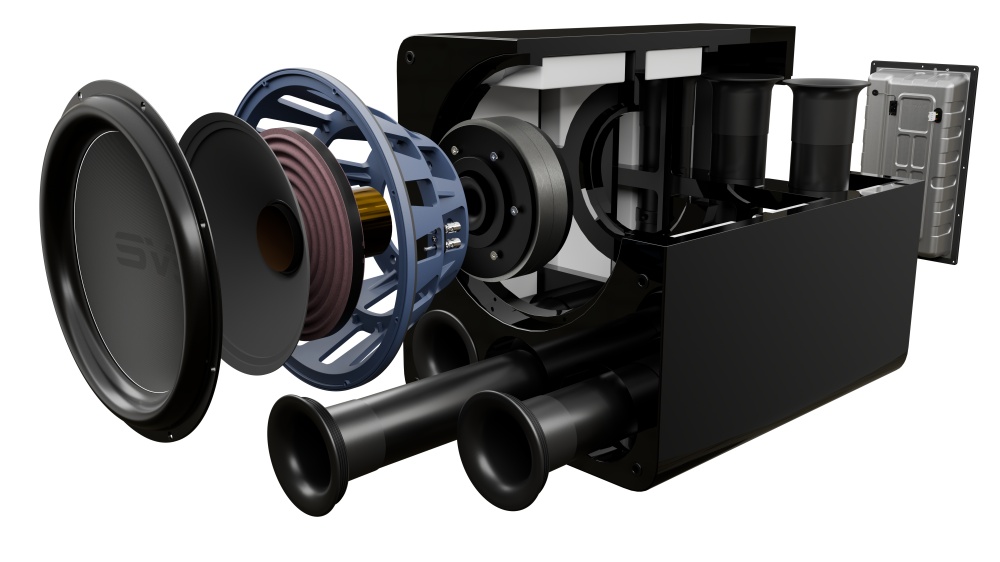 Thiết kế có ba cổng 3,5 inch cho độ mở rộng bass sâu hơn sealed, với tùy chọn bịt cổng để chuyển chế độ; ampli kép đảm bảo công suất ổn định và mát mẻ.