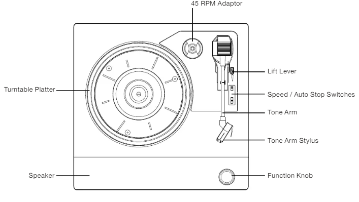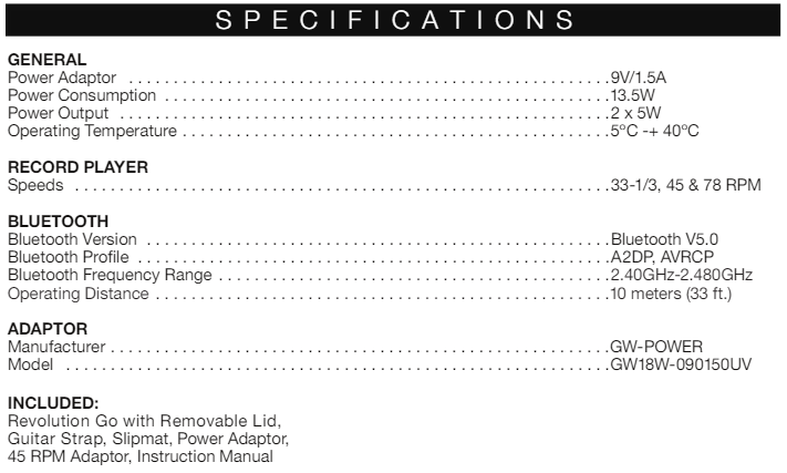Để dễ dàng mang theo, Revolution GO có tay cầm có thể thu vào và dây đeo đàn ghi-ta có thể tháo rời, có thể thay thế bằng dây đeo đàn ghi-ta mà bạn chọn để có giải pháp mang tùy chỉnh. Nắp có thể tháo rời đóng vai trò như một màn hình hiển thị năm bản ghi vinyl trong ngày của bạn.