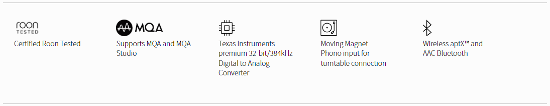 Bộ chuyển đổi Kỹ thuật số sang Tương tự (DAC) 32-bit cao cấp của Texas Instruments kết xuất các nguồn kỹ thuật số được hỗ trợ bởi các bộ lọc đầu ra bên ngoài độc quyền, được điều chỉnh tùy chỉnh, đảm bảo âm thanh được trình bày dễ dàng với chi tiết sống động đặc biệt và khả năng biểu đạt âm nhạc. Đầu vào Analog, Digital, XLR, aptXTM và AAC Wireless Bluetooth và Moving Magnet Phono Stage đảm bảo kết nối với các nguồn nhạc yêu thích của bạn. Các tệp phương tiện kỹ thuật số được hỗ trợ thông qua kết nối PC-USB 32-bit/384kHz hỗ trợ MQA và được Roon Tested chứng nhận đầy đủ để truy cập dễ dàng vào danh mục âm nhạc trực tuyến gần như vô hạn.