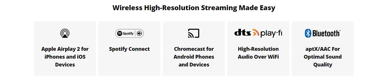 Với 6 cài đặt trước tùy chỉnh để truy cập nhanh vào danh sách phát, dịch vụ phát nhạc trực tuyến và hơn thế nữa chỉ bằng một nút chạm / Âm thanh đa phòng/Toàn bộ ngôi nhà tương thích với tất cả các sản phẩm hỗ trợ DTS Play-Fi.