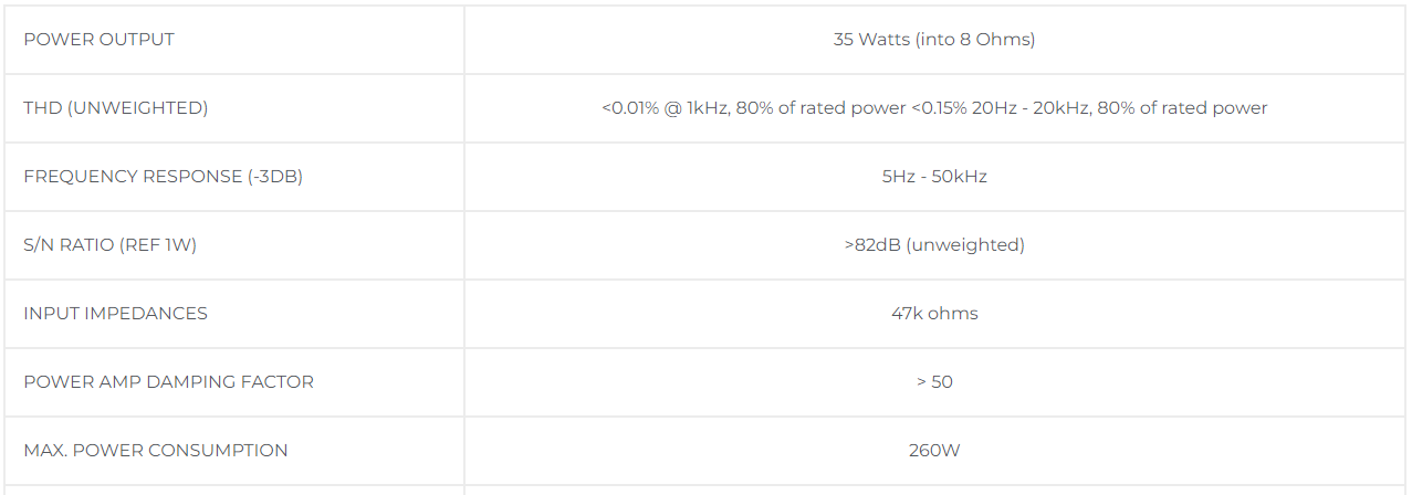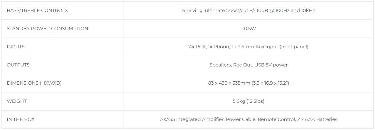 Ampli tích hợp AXA35 có công suất khuếch đại là 35 Watt/kênh, được trang bị 4 ngõ vào RCA, 1 ngõ vào 3,5mm tại mặt trước máy, 1 ngõ ra RCA và cổng USB để gắn bộ thu sóng Bluetooth cho những ai muốn trải nghiệm âm thanh không dây.Ngoài ra,AXA35 còn có thêm một ngõ vào phono và ngõ xuất âm tai nghe jack 6,3mm, giúp tăng thêm sự linh hoạt cho sản phẩm này.